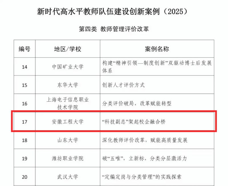 此次案例入选是对学校教师队伍建设和人才评价改革成效的充分肯定。学校将以此为契机,持续深化“科技副总”机制创新,加强经验总结与示范推广,为加快建设教育强国、培养造就高素质专业化教师队伍贡献“安工程智慧”。